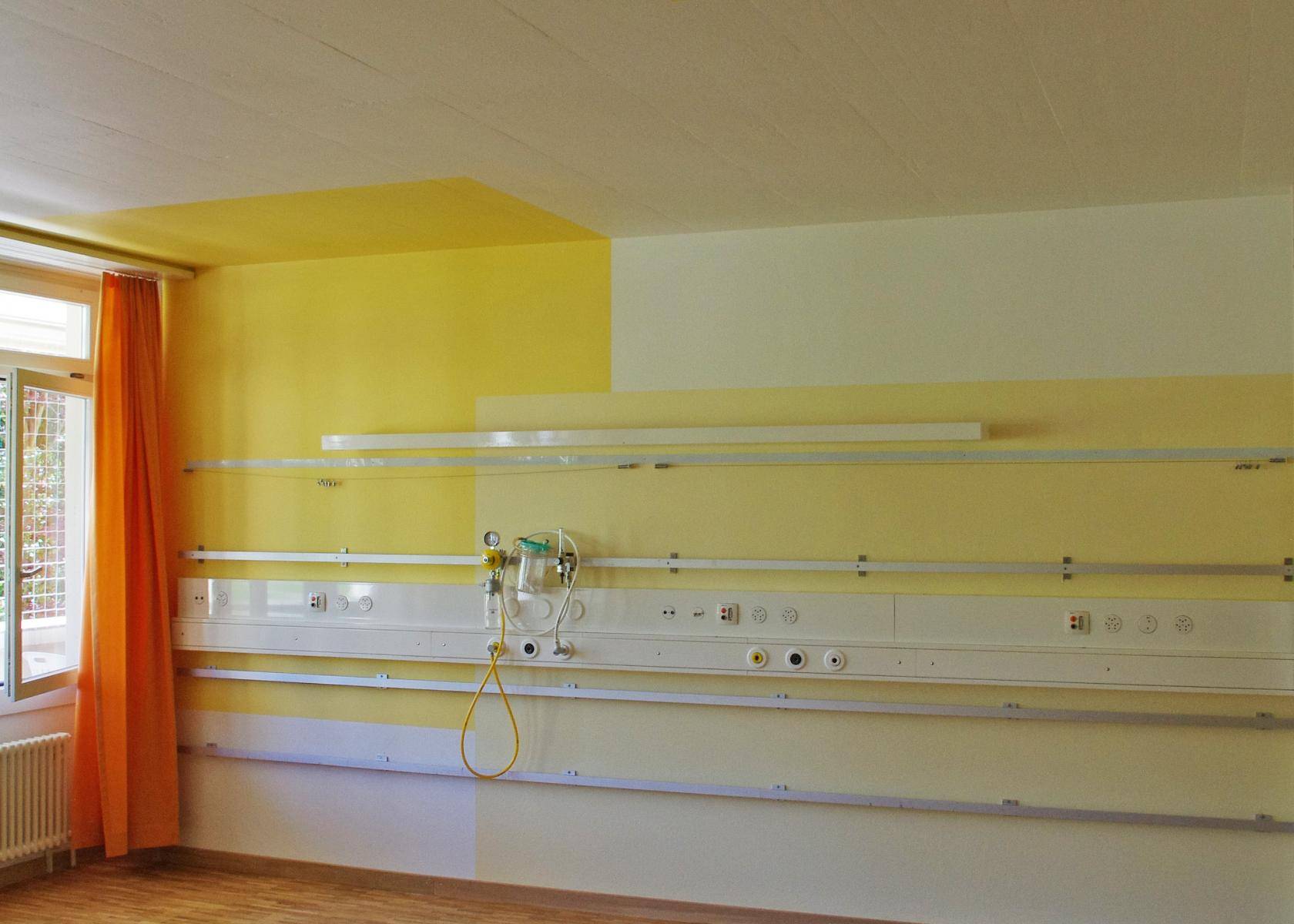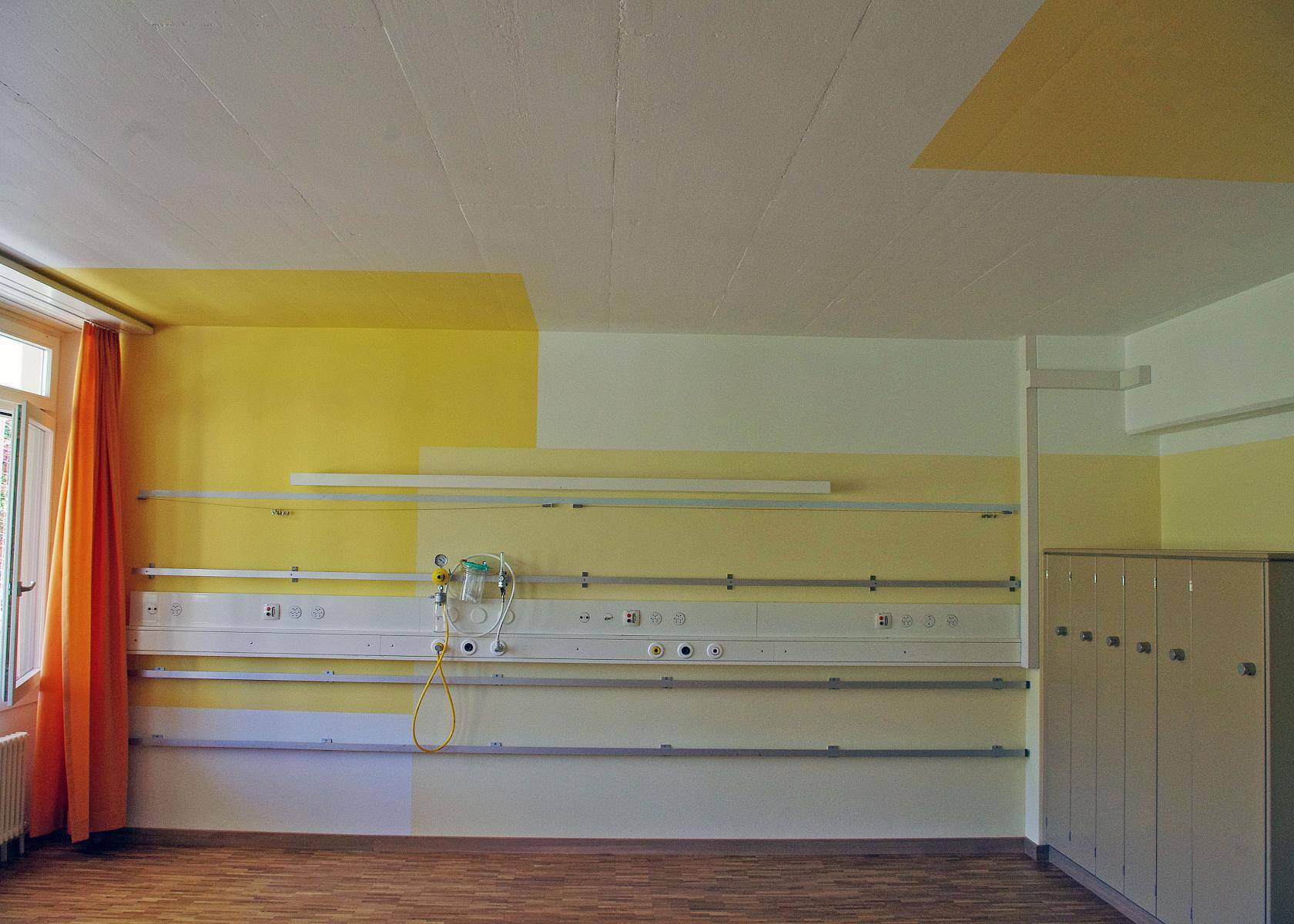 | Kinderspital Patientenzimmer Previous Next Previous Next Zurück zur Übersicht Warme Farben entlasten angespannte Gefühle im Kinderspital.